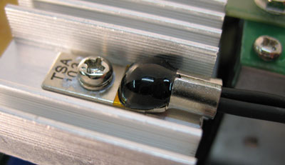 برای اینکه بدانیم یک پاور قابلیت OTP یا تشخیض دمای بالا را دارد اگر نگاهی به هیت سینک آن بیندازیم یک سیم به نام ترمیستور باید به آن متصل شده باشد که البته نامی برای آن نوشته نشده ولی از حالت بسته شدن به هست سینک که معمولا پیچ شده و دارای روکش محافظ است کاملا قابل تشخیص است. عکس زیر نمونه thermistor است: