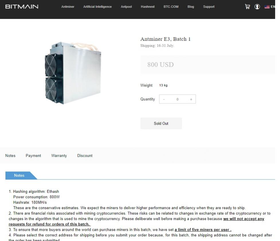 در این مطلب که در توییت بیتمین اعلام شده ، Bitmain، Antminer E3 را به عنوان قدرتمندترین و کارآمدترین ماینر EtHash ASIC معرفی می کند. قیمت واحد هر دستگاه 800 دلار خواهد بود و با توجه به این توییت در چین موجود نیست و نمی توان آنرا به هنگ کنگ، ماکائو یا تایوان منتقل کرد. سفارشات برای هر نفر محدود به یک عدد است. Bitmain تنها بیت کوین (BCH) و دلار آمریکا را می پذیرد.