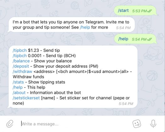 سازنده برنامه "Tip me BCH" یعنی Andreas Brekken این برنامه را ساخته تا کاربران بتوانند BCHهای دوستان خود و یا دیگر کاربران تلگرام را به صورت تصادفی tip کنند. این بات بر روی برنامه پیام رسانی آنی بسیار خوب عمل میکند و این بات تعداد دستور مانند ‘deposit’، ‘tipbch’، ‘balance’ و دیگر دستورات را ارائه میدهد. Brekken میگوید که کابران باید تنها مقدار کمی سرمایه در بات نگه دارند چرا که ممکن است در اثر باگ برنامه، BCH های خود را از دست بدهند. کد اصلی برنامه در Github برای مشاهده وجود دارد. Brekken بیان کرده است که این نرم افزار "کاملاً تجربی است و ممکن است منجر به از دست رفتن سرمایه ها شود".